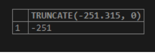 Thus, the TRUNCATE() function returns the number truncated to the specified decimal places. When the decimal places value or parameter of the TRUNCATE() function is not provided, the number to be truncated is rounded down to 0 fractional points. Remember that the second argument of the TRUNCATE() function should be either a positive or negative integer.