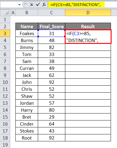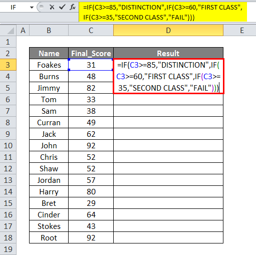 Here, the Nested IF formula directs Excel to evaluate the logical test for the first IF function; in the result, if the condition or criteria is met, then it returns the supplied value (“DISTINCTION”) in the value_if_true argument. Otherwise or else, If the condition or criteria of the first If function is not met, then go ahead and carry out or test the second If statement and follow a similar step until the last criteria.