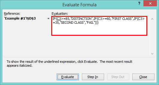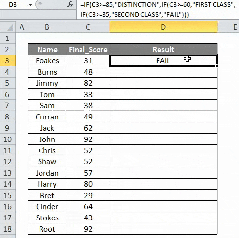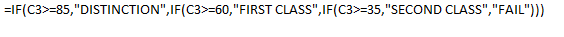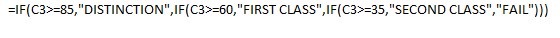 =IF(C3>=85,”DISTINCTION”,IF(C3>=60,”FIRST CLASS”,IF(C3>=35,”SECOND CLASS”,”FAIL”)))