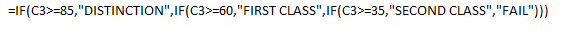 =IF(C3>=85,”DISTINCTION”, IF(C3>=60, “FIRST CLASS”, IF(C3>=35, “SECOND CLASS”,
