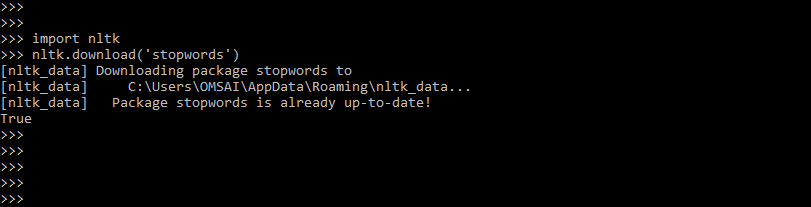 - In the above example, we have seen that after executing the download command, it will show that the package of stopwords is up to date, and we have no need to download anything to use the nltk stopwords in our code.
