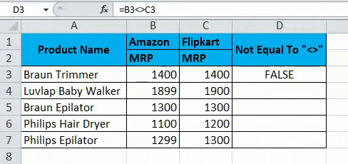 - We can see that the formula =B4<>C4; in this case, Amazon MRP is not equal to Flipkart MRP. So Excel will return the output as TRUE, as shown below.
