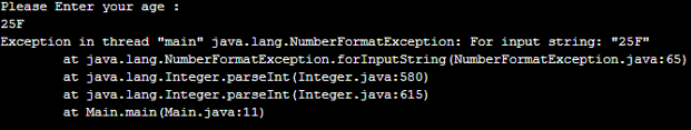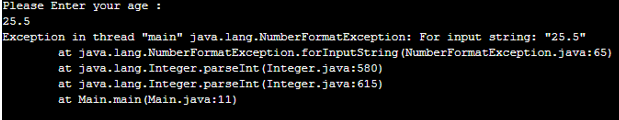 Explanation: As in the above code, the age value is accepted from the user in string format, which further converts into the integer format by using the Integer.parseInt(sc.next()) function. While the user an illegal input string or not a well-formatted string, the NumberFormatException occurs, it throws, and the program terminates unsuccessfully. So to provide the valid string, it should be taken care that an input string should not be null, check an argument string matches the type of the conversion function used and also check if any unnecessary spaces are available; if yes, then trim it and so all care must be taken.