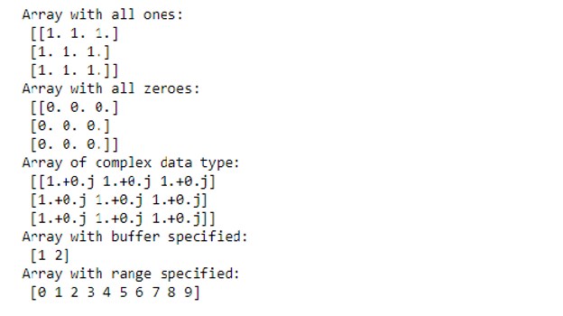 Numpy provides several built-in functions to create and work with arrays from scratch. An array can be created using the following functions:
