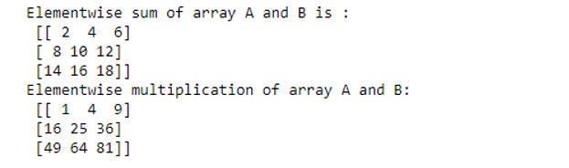 print ("Element wise sum of array A and B is :\n", A + B)