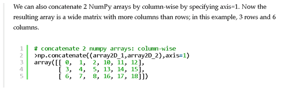 - a1, a2, …sequence of array_like: The arrays that have been entered by the user must be of the same shape (i.e., dimension) except for the consideration of the dimension that corresponds to the specified axis. In case the user has not specified the axis, the default value for the axis remains as the first axis,