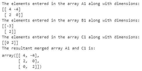 If the shapes of the areas to be concatenated disagree, an error message will be displayed when the system displays the output. In such cases, the reshape function can be used to generate an erasure of the same shape for the required result and shape, allowing arrays of varying shapes and dimensions to be merged. The concatenate function can also be used to merge two arrays column by column. If the axis is set to 1, the resulting array is column-wise merged, resulting in a broad matrix with more integers than the number of columns.