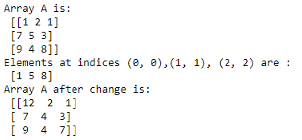 print ("Elements at indices (0, 0),(1, 1), (2, 2) are : \n",B)