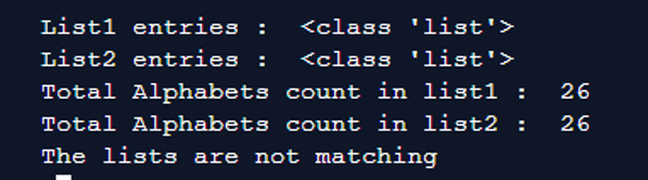Explanation: The program above matches two separate lists. The” == “operator is used for matching the lists. Here one list consists of lowercase values, whereas the other list consists of uppercase values. The equal to operator matches both lists; if the match exists, a console message has been printed here.