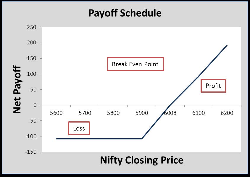 John is bullish on Nifty. On 25th May, the Nifty was at 5943.55. John buys a call option with a strike price of Rs. 5900 and a premium of Rs. 108, which expires on 31st July. If the Nifty goes above 6008 (5900+108), Mr. John will make a net profit (after deducting the premium) on exercising the option. If the Nifty stays at or falls below 5900, he can forego the opportunity (it will expire worthless) with a maximum loss of the premium.