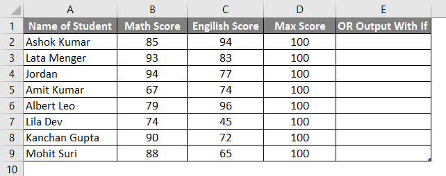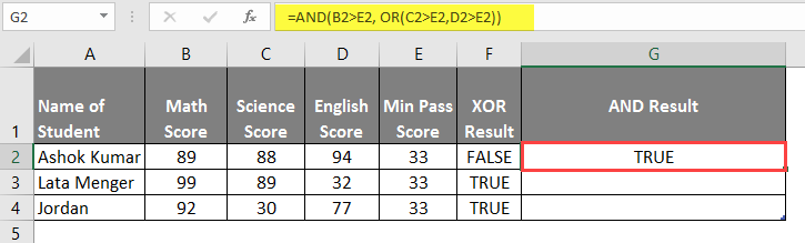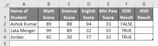 - To apply AND Formula with OR, we will create one Header in the F column and check if any student has passed in Math Science or English.