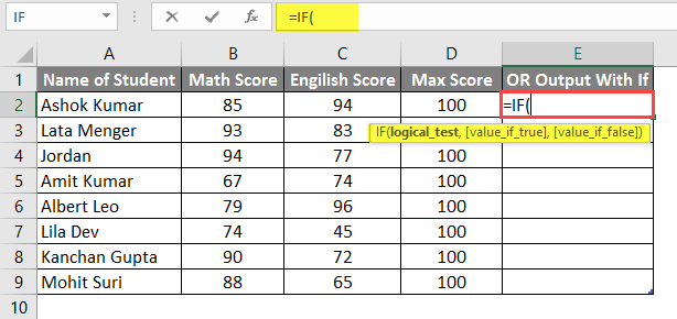 - Create a header column with ‘OR Output With If’ in column, E to execute the OR function.