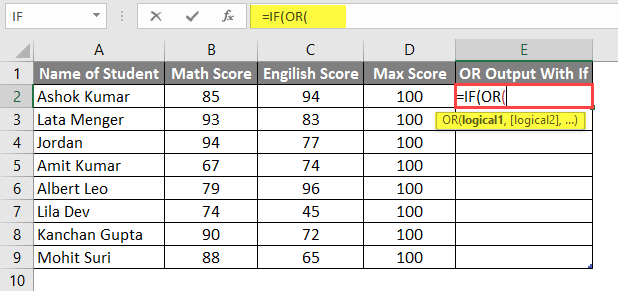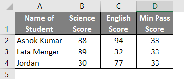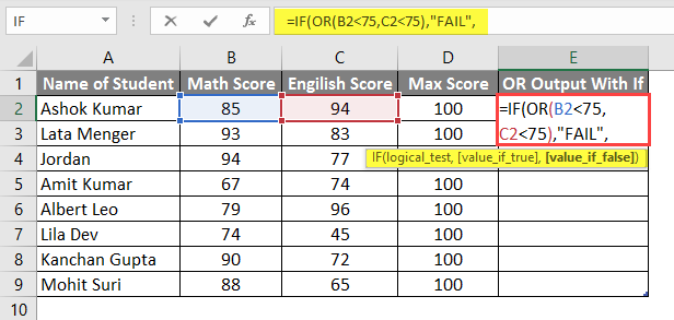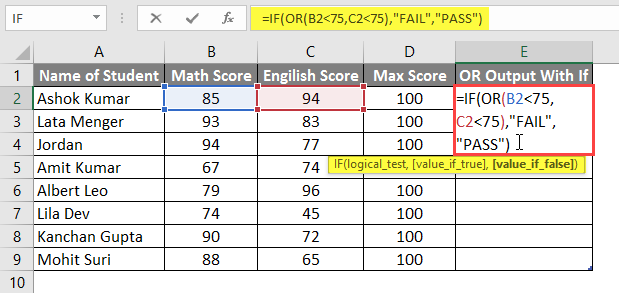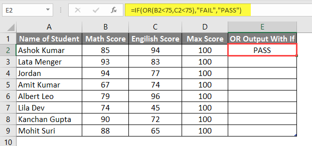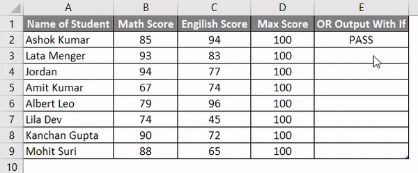 Let’s see how the ‘OR’ and ‘IF’ functions can solve this problem to evaluate the Fail or Pass status of the student.