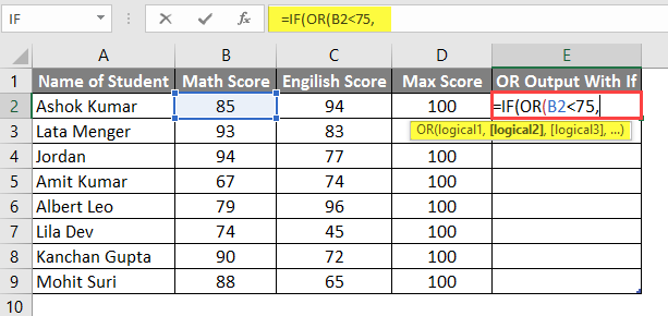 - Now it will ask for Logical1, Logical2, … which is an English score that must be compared against a passing score of 75. So, just compare the English Score, available in Column C.