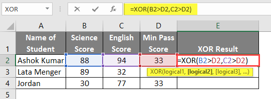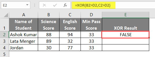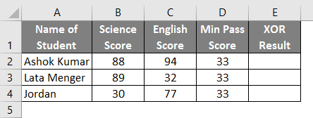 - Create a header column with XOR Result in the E column where we will execute the XOR function.