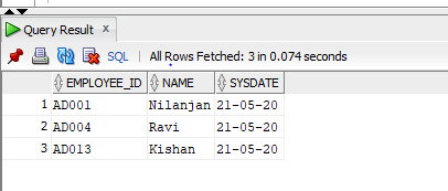 As we can see in the output the SYSDATE function inserts the current date and time in the table.