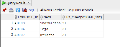 In the previous scenario and its examples we have seen how we can use the SYSDATE function with SELECT statement along with WHERE condition. In this scenario we will see how we can use a TO_CHAR function along with SYSDATE function to extract only the day from the SYSDATE function. One important note is that the value returned will not be DATE value as we are using TO_CHAR function. It will be a string value. The example is to extract the employee name, employee id and current day from the employee table where the city of the employee is ‘Mumbai’. Let us create a SELECT query for this task.