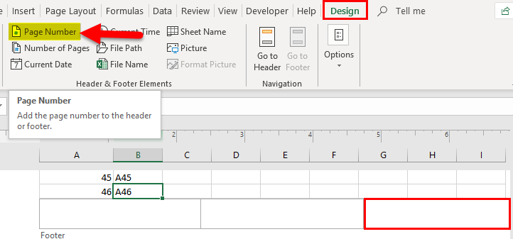 - Click on any block of footers and then click on a Page number from the Design Tab.