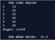 Explanation: Here the panda’s library is initially imported and the imported library is used for creating a series. The values in the series are formulated in such a way that they are a series of 10 to 60. the mean() method is used for determining the mean value of the series and print it on to the console. So on the current given series we can notice the mean value is been generated and printed precisely.