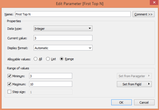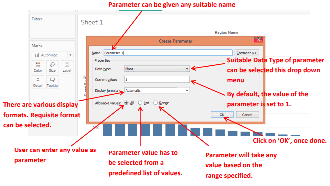 In the above part, we learned to create and use the parameter. In this case, we allowed the parameter to take any value by selecting “All” in “Allowable values.” Now, we will try to explore the other two options, viz. List and Range.