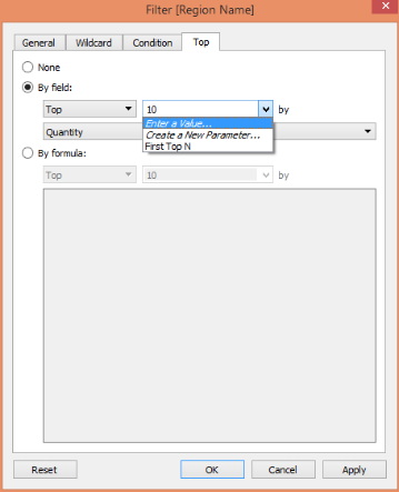 Here there are two options: Top and Bottom. Selecting the top will output Top performers based on “Quantity” using the “First Top N” parameter. Selecting Bottom shall do the reverse. Finally, Click on “Apply” and then on “OK.”