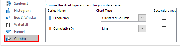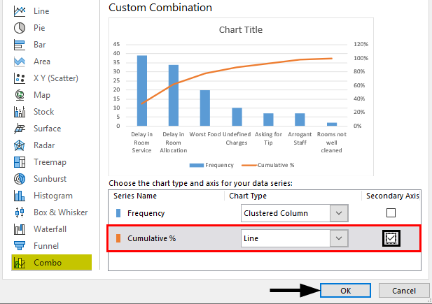 Step 10: Now, under Custom Combination, select and tick the Secondary Axis option for the Cumulative % series. The Cumulative % values will be plotted on the Secondary Axis. Click on the OK button once done. See the screenshot below:
