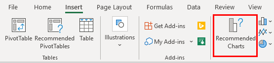 Step 7: Under the Charts group, click the Recommended Charts option. And you will see all the charts which can be used to represent this data visually.