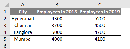 Consider the employee population from 2018 to 2019 for a few cities. We want to find the change in the number of employees between 2018 and 2019.