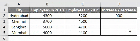 First, calculate the difference between the two years by subtracting the 2018 data from the 2019 data. We can do this using the formula “=C2-B2” in cell D2.