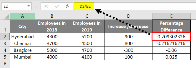 Since the base value is the 2018 data, we must calculate the percentage change on its basis. To do this, we divide the difference value of each city by their respective 2018 data. For instance, we divide the difference value of Hyderabad by 4300, Chennai by 3700, Bangalore by 5000, and Mumbai by 4000.