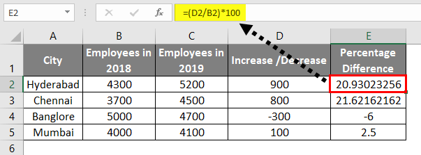 You will get the percentage difference as a decimal value. One must multiply the decimal value by 100 to increase readability to get the exact percentage.