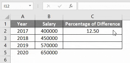 Apply a formula, “=(B3-B2)*100/B2,” in cell C2 to find the Excel percentage difference in salary from one year to the following year.