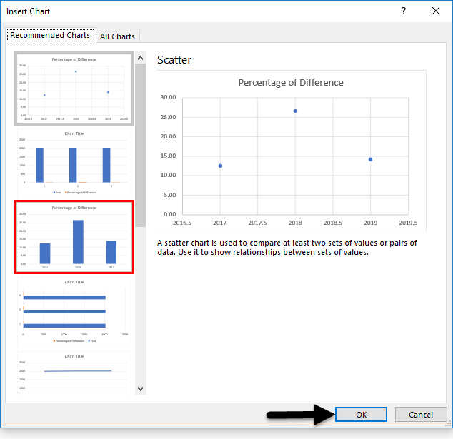 We can select the required chart form from the drop-down to represent the percentage change visually.