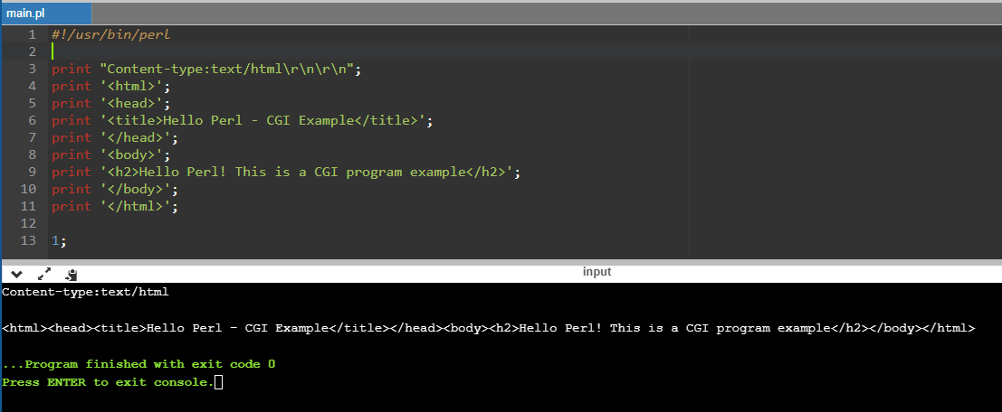 print '<h2>Hello Perl! This is a CGI program example</h2>';