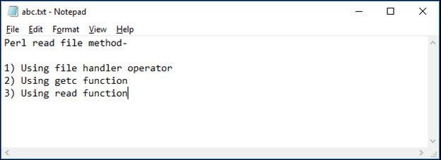 In the above example, we have to use the abc.txt file to describe the example of read file using getc function in Perl. We have read the first character from the file using getc function in Perl.