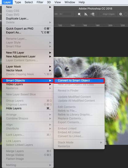 Step 1: Select your image file in Adobe Photoshop. Here we will be using the koala bear image. To start, right-click your image and choose to Convert to Smart Object or click on Layer, then Smart Objects and Convert to Smart Object.