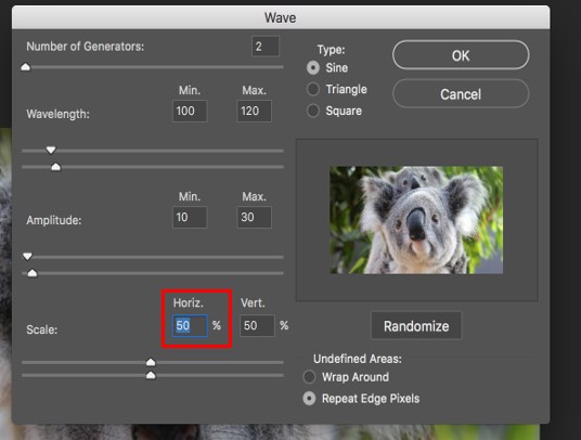 After you select the wave effect, you will get a dialog box. Here you can modify any of the alternatives as per your need, but for this example, select the number of generators to be 2. Next, set the Wavelength to minimum 100 and maximum to 120 and the Amplitude to a minimum of 10 and maximum to 30. Then select the Scale to be 50% horizontal and vertical, respectively. You can select your Type as Sine, Triangle, or Square. Here we will select Sine. For Undefined Areas, select Repeat Edge Pixels. Once all these settings are done, you can hit randomize until you decide on the preview you wish to use. This merely provides the koala bear with a minute jagged effect, as you can see below.