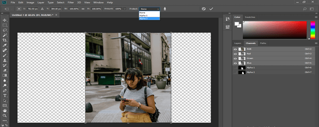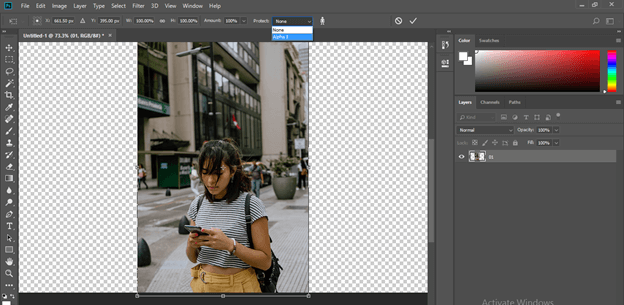 Now go to the property bar of the content-aware option and choose the Alpha 1 option in the Protect option of the property of Content-Aware option. So that during extending the background of the image it will protect the selection of the Alpha 1 channel.