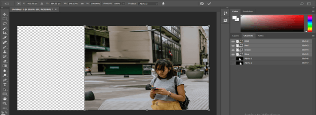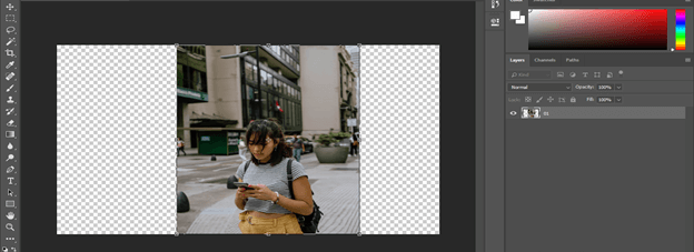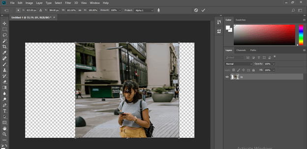 Now press the Ctrl + T button of the keyboard to transform a box of this image and increase the size of this image in the horizontal direction for extending the background of this image, and you will notice the pixels of the girl of the image will destroying with increasing size. Let us resolve this problem by using the content-aware feature of this software.