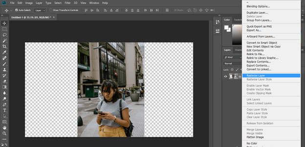 Make this layer Rasterize. For making it rasterize, go to the Layer panel and make right-click on it with the mouse right button. A drop-down list will be open to choosing the Rasterize Layer option from the list.