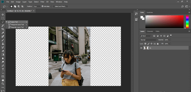 So for avoiding this, let us use another technique of this software. Take any selection tool from the tool panel of this software. I will take the Lasso tool by clicking on it to select this girl, which is our main content. You can make a selection with any other selection tool as per your choice.