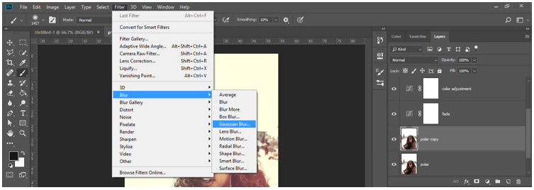 Now select this copy layer and go to the Filter menu of the menu bar then click on it. Go to Blur option of the list and choose the Gaussian Blur option from a new list.
