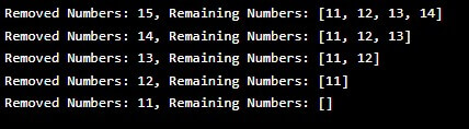 print(f"Removed Numbers: {number}, Remaining Numbers: {numbers}")