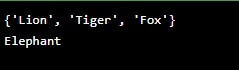 print(Animals) # Output: {'Lion', 'Tiger', 'Fox'} (Note: The removed element is arbitrary.)