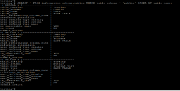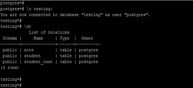 In the above example, we first connected to the default database, i.e., Postgres database; connecting to this database will only display the connected databases’ tables. In the first example, the Postgres database contained no tables to return an empty set. But in the second example, we have connected to the testing database; after connecting to the testing database, it will display all tables from the testing database.