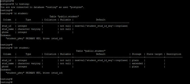 - \dt+: This command is used to show all table descriptive output from the connected database.