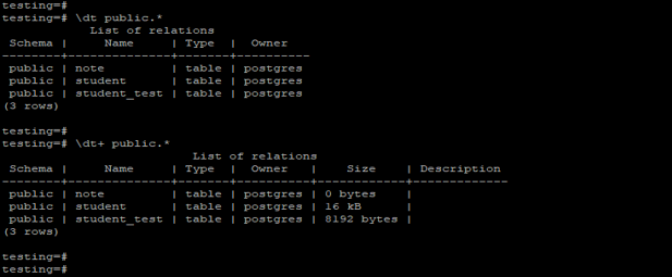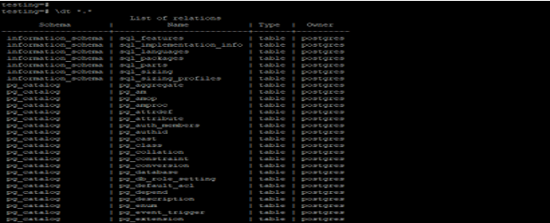 - \dt *.*: This is used when we want to show all the schema tables; first, * define as all schema and second, will define as all tables.