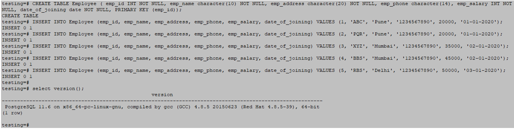 CREATE TABLE Employee ( emp_id INT NOT NULL, emp_name character(10) NOT NULL, emp_address character(20) NOT NULL, emp_phone character(14), emp_salary INT NOT NULL, date_of_joining date NOT NULL, PRIMARY KEY (emp_id));