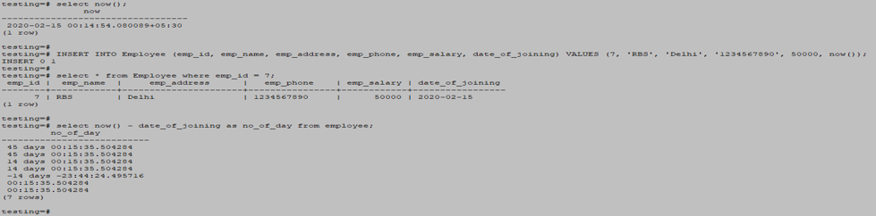 INSERT INTO Employee (emp_id, emp_name, emp_address, emp_phone, emp_salary, date_of_joining) VALUES (8, 'RBS', 'Delhi', '1234567890', 50000, now()::date);