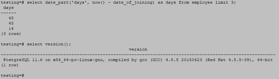 select date_part('days', now() - date_of_joining) as days from employee limit 3;